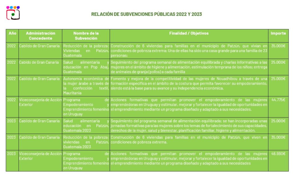 Desde el año 2019, la asociación está recibiendo subvenciones del Cabildo de Gran Canaria y el Gobierno de Canarias, Viceconsejería de Acción Exterior, que han hecho posible la realización de muchos más proyectos. También se ha podido ampliar la ayuda a otros países, como Senegal, Mauritania y Uruguay.